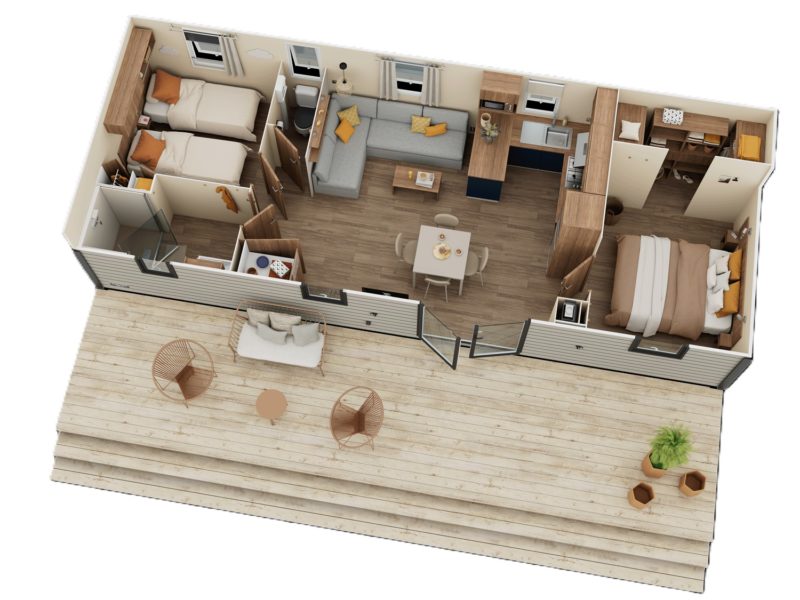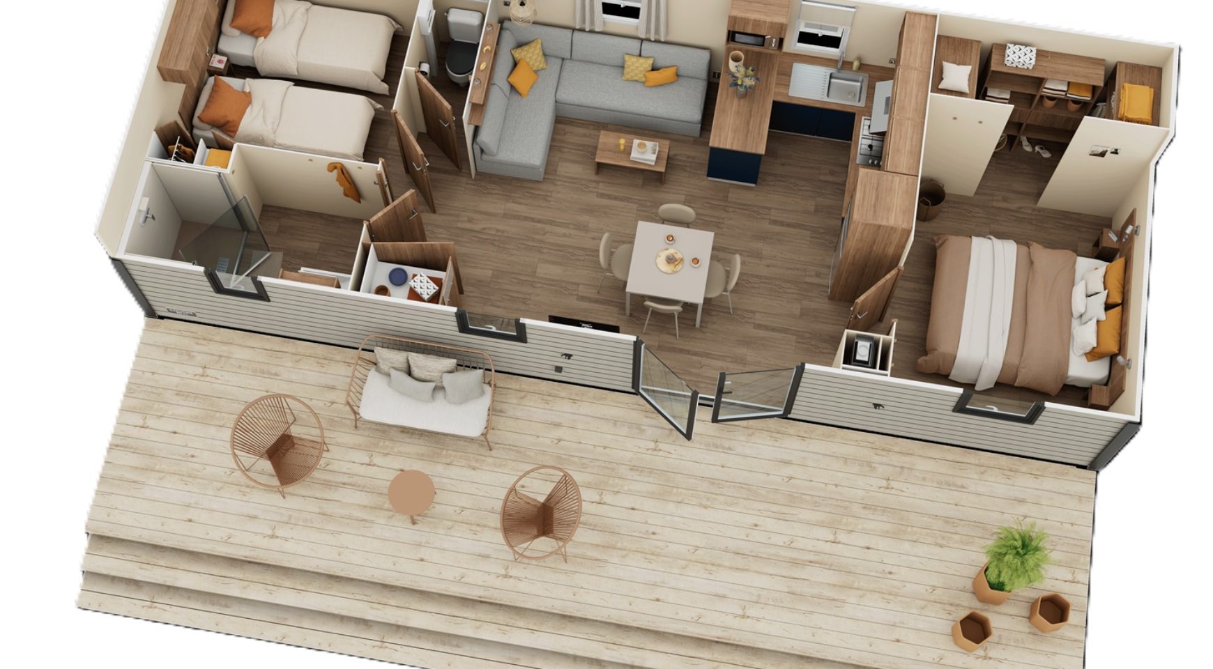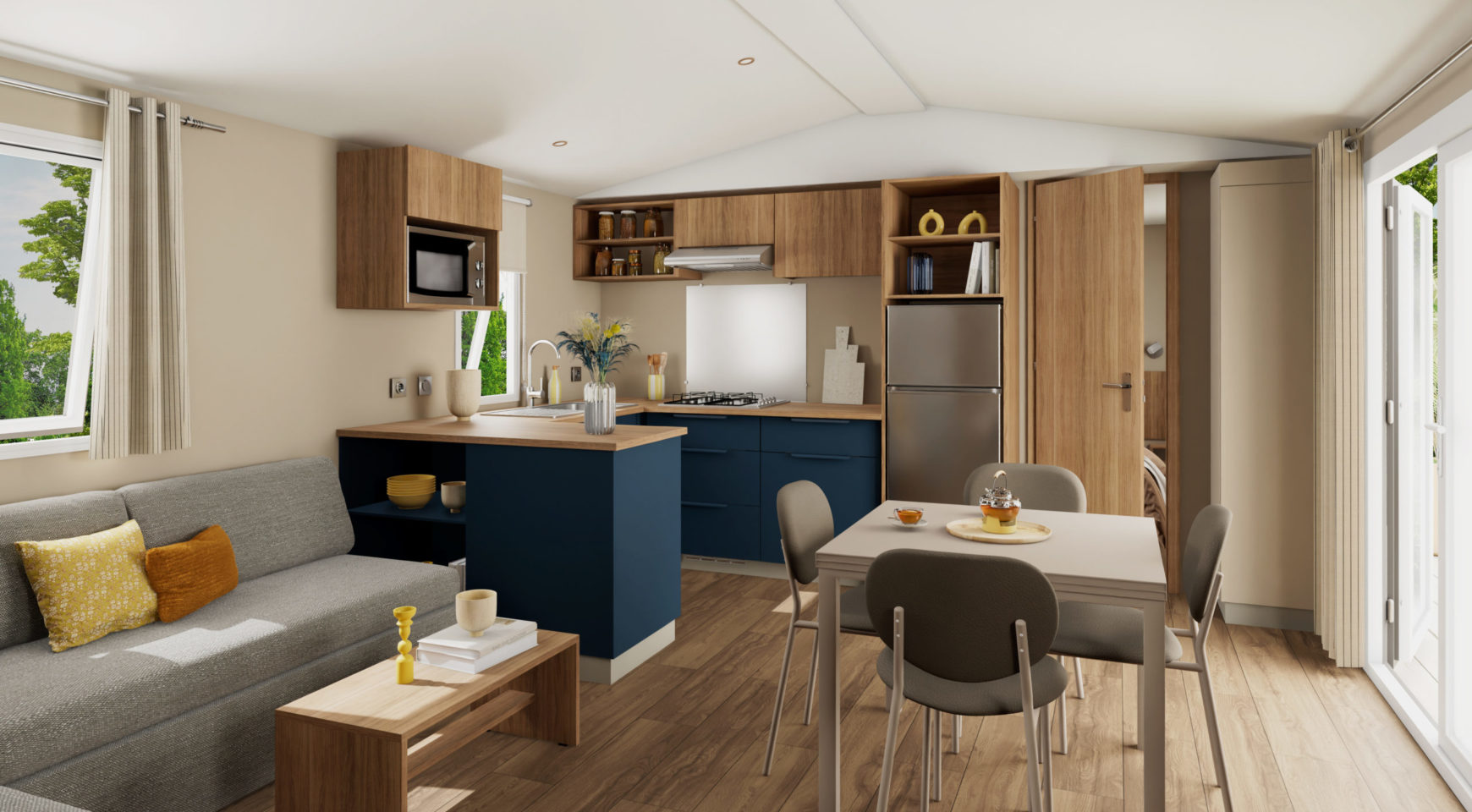 Avec sa chambre principale au large dressing et sa cuisine toute équipée et très spacieuse, ce modèle offre tout le confort nécessaire pour vivre des moments hors du temps.