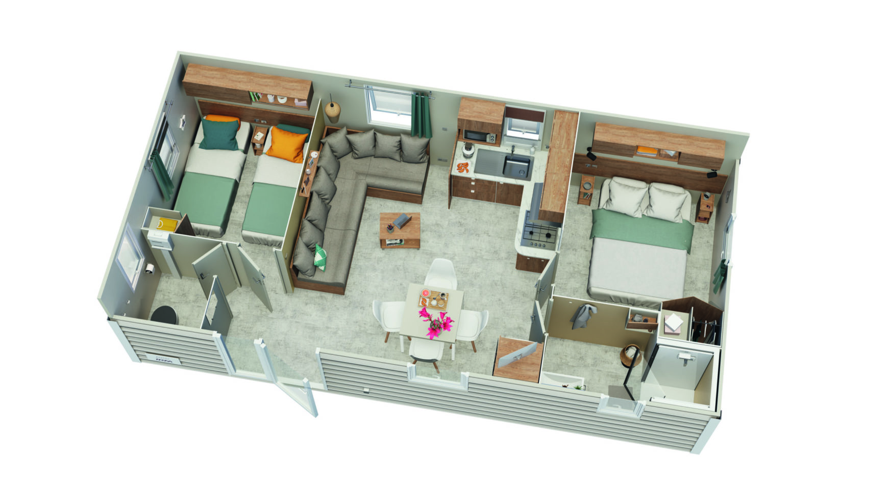 Un modèle 2 chambres compact, pour profiter sereinement du confort d’un intérieur pratique et bien pensé.