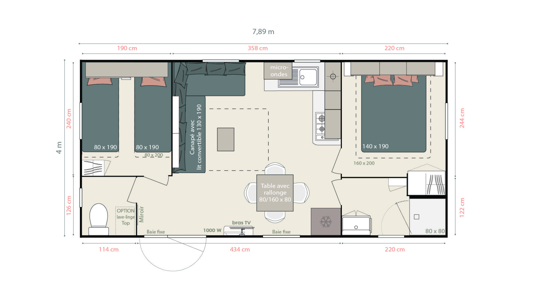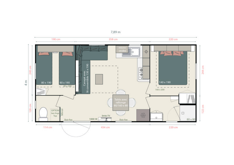 2 Chambres – 1 Salle de bain – 4|6 personnes – Dimensions : 7m89 x 4m – 28.3m²